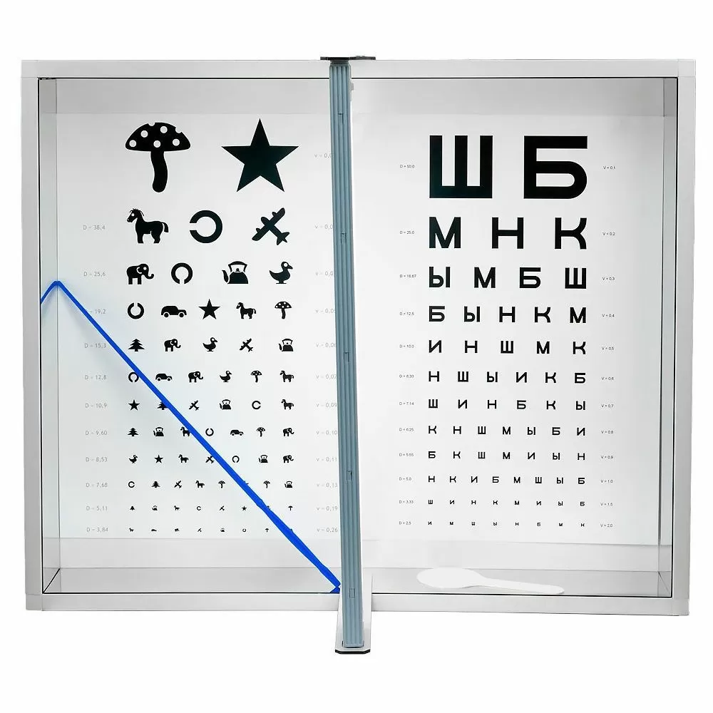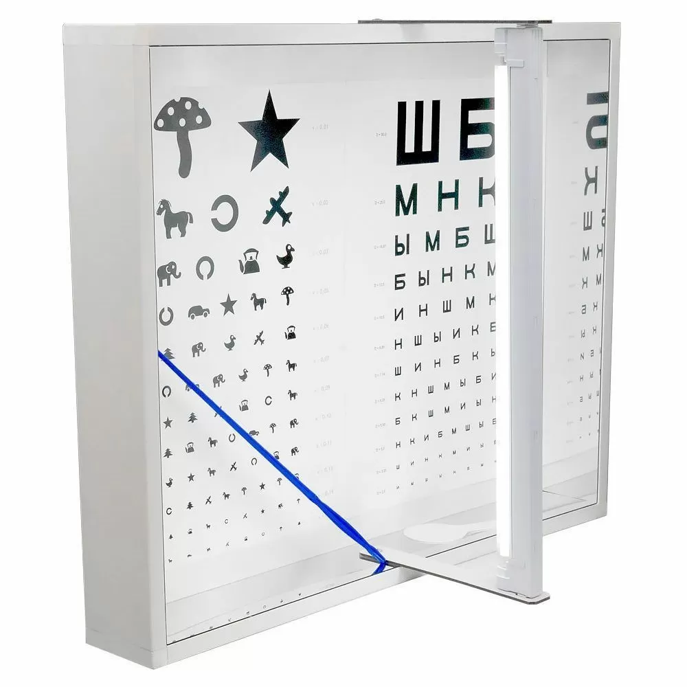 Осветитель таблиц российского производства выполнен в пластиковом корпусе, внутренний периметр которого, снабжен зеркальные отражатели. Внутри, на задней стенке корпуса закрепляются таблицы для проверки остроты зрения.