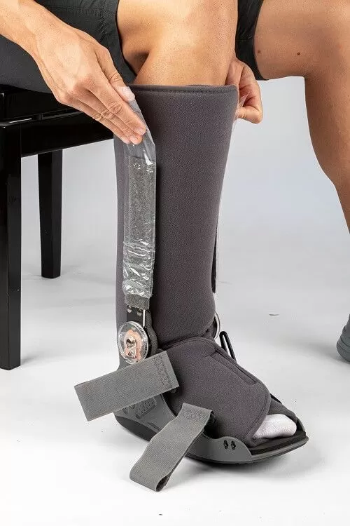 • В комплект входят две пластины для иммобилизации большеберцовой кости и икроножной мышцы, а также предусмотрены дополнительные уплотняющие пелоты для регулировки внутреннего объема и лучшей стабилизации ноги в ортезе и защитный чехол для пальцев стопы, который можно снять для дополнительной вентиляции.