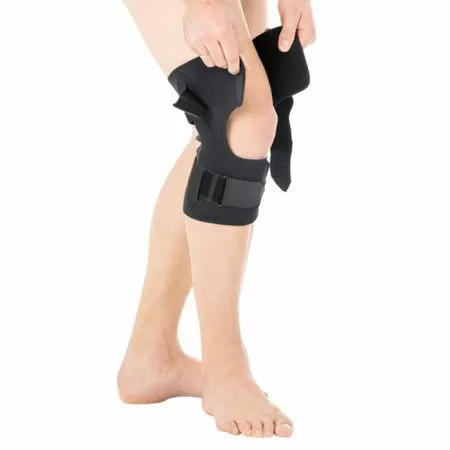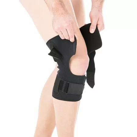 - снабжен двумя металлическими шарнирами, обеспечивающими правильную биомеханику коленного сустава