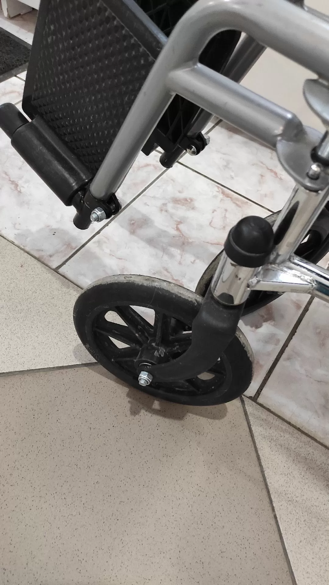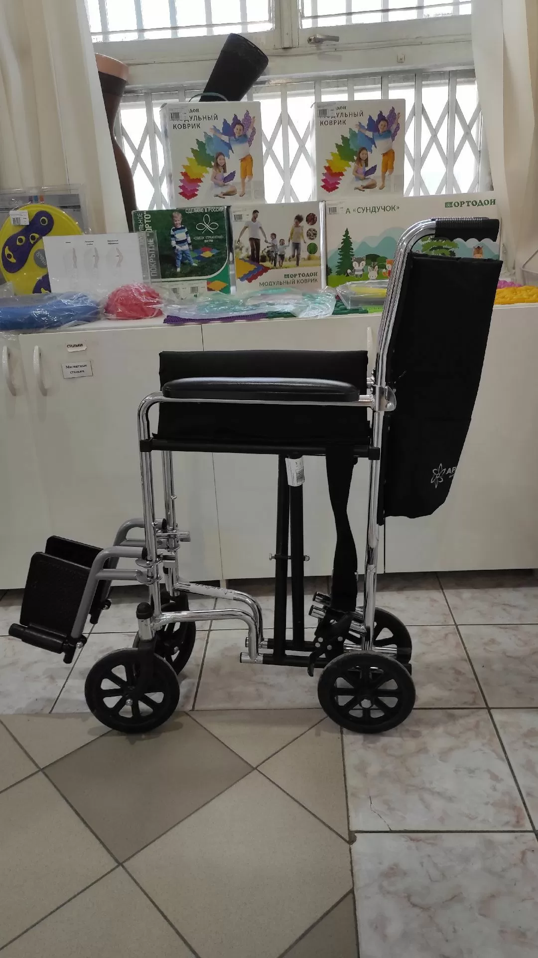 Цельнолитые колеса позволяют с комфортом перемещаться в помещении. Фиксируется положение с помощью стояночного тормоза. Для удобства пересаживания подножки поворачиваются и снимаются. Подлокотники фиксированные с мягкими накладками, и на них удобно опираться. Спинка складывается с помощью рычагов, что освобождает доступ к спине пациента. Рама тоже складная, поэтому каталку получится убрать очень быстро.
