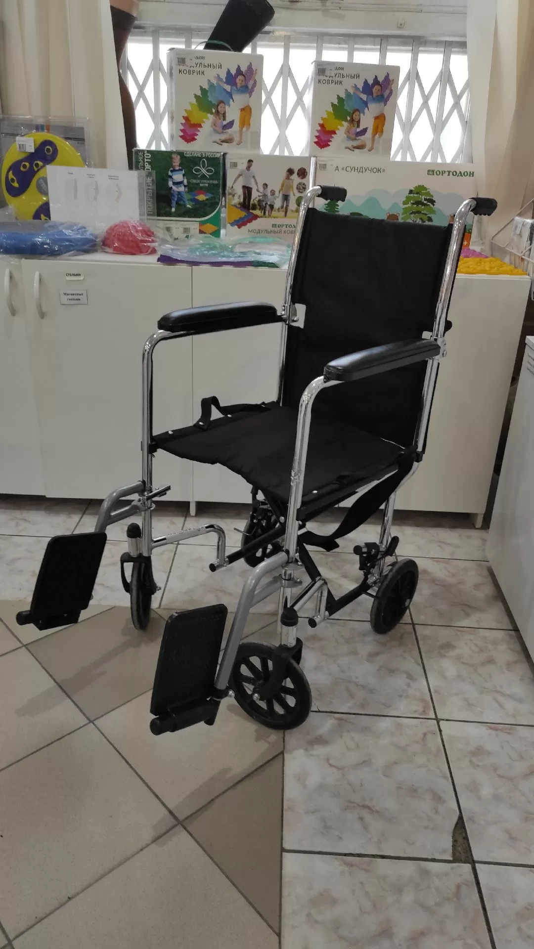 - Поскольку подножки можно откинуть наверх, пересаживаться пользователю значительно легче. Для перевозки при сложении кресла подножки снимаются.