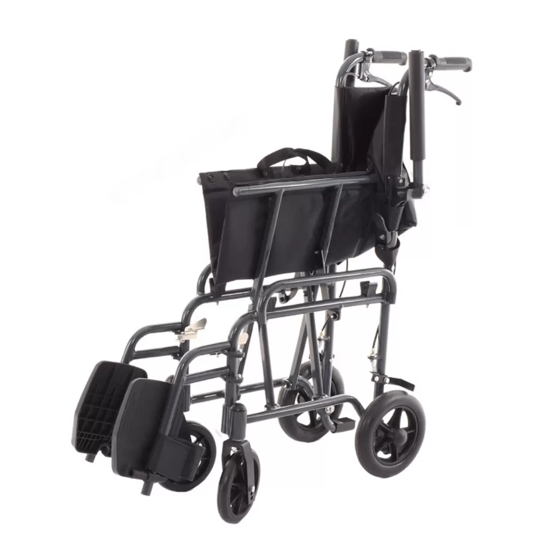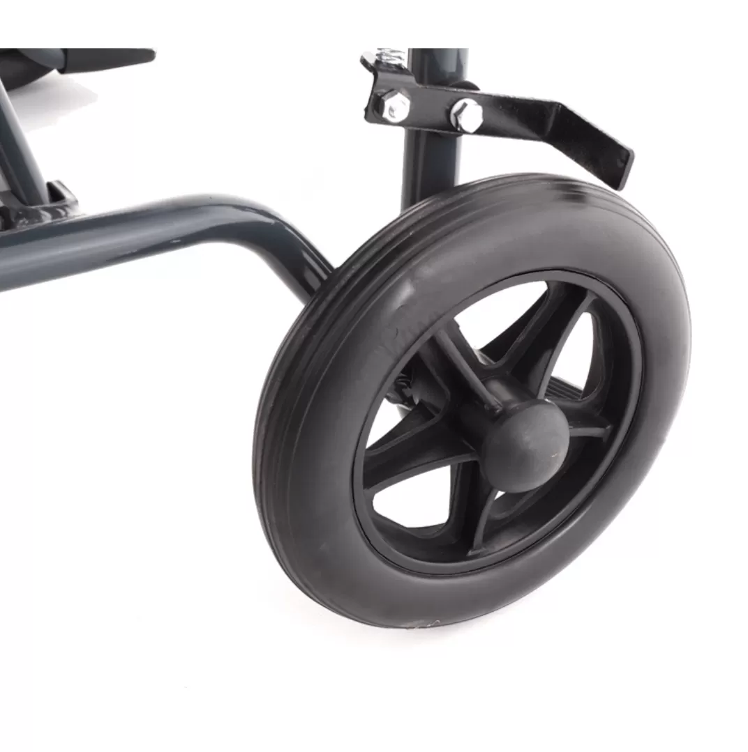 Рама каталки складывается "сторона к cтороне" и оборудована складной спинкой для максимально компактного сложения при транспортировке. Поднимающиеся подлокотники из алюминиевой трубы, покрытой мягким пористым пенополиуретаном.