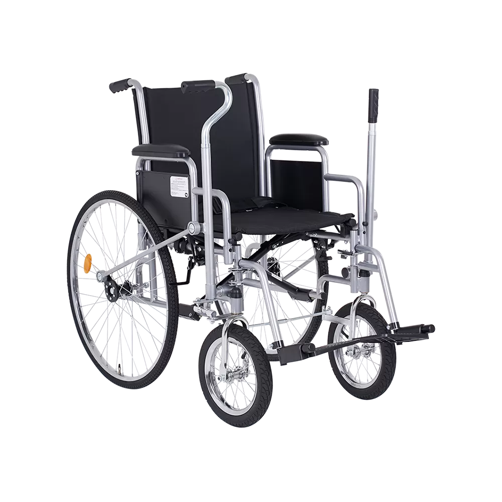 - Коляска оборудована рычажным управляющим механизмом – рулевого и тягового рычагов. С их помощью пациент сможет самостоятельно управлять коляской, меняя скорость передвижения и направление. Рулевой рычаг расположен под правую руку.