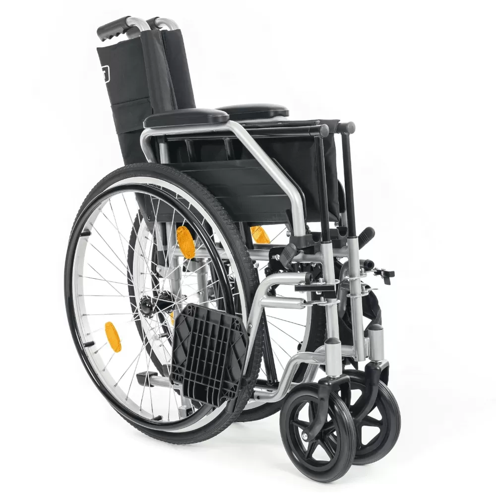 Съемные антиопрокидыватели делают езду в гору безопасной. Коляска снабжена откидными подножками и стояночным тормозом, что делает пересаживание человека из коляски и в неё более безопасным и удобным.
