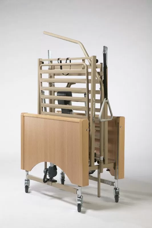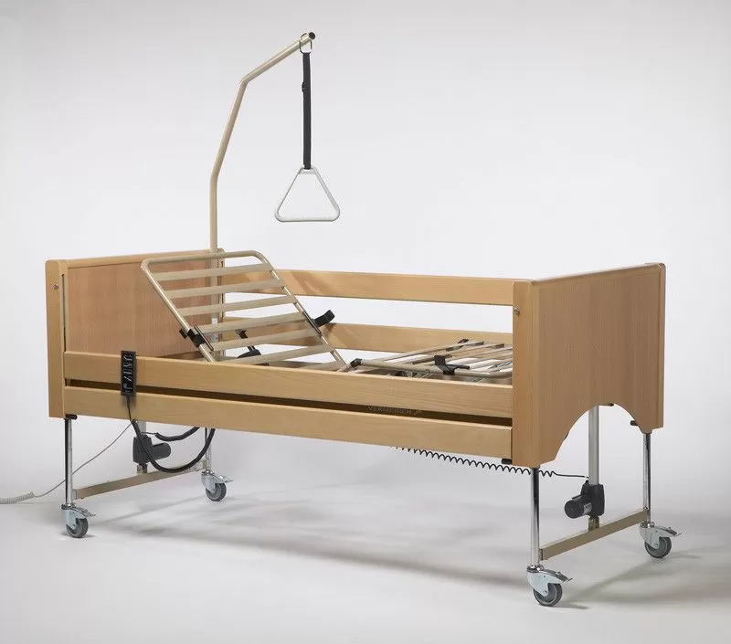 Медицинские кровати Luna дополнительно укомплектованы подвеской для капельницы. Капельницы на два крючка могут держаться на креплениях в пяти отверстиях, которые находятся в стойке для подтягивания. В головной и ножной частях изделия расположена телескопическая направляющая система с шаровой опорой поднятия и опускания, не выступающая за габариты кровати. Она спрятана в спинке за деревянной панелью. Медицинская кровать имеет возможность подключения системы детекции пользователя, подключающейся к кровати пациента и в комнате медицинского персонала. Основание матраца разделяется на несколько секций, таких как, спинная, тазобедренная, ножная и зафиксированная промежуточная. Кроме промежуточной, все секции регулируются по углу наклона. Рама матраца регулируется в горизонтальной плоскости верх, вниз и в наклонное положение. Матрацная основа выполнена из стальных перекладин. Данная модель обеспечит максимальный комфорт для пациента.