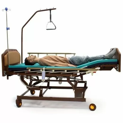 Функциональная кровать с электроприводом, электрифицированной функцией переворачивания и туалетным устройством. Головная секция имеет "ушки", что позволяет больному отдыхать и спать в сидячем положении.Кровать оснащена быстросъёмными спинками. Сняв ножную спинку можно осуществить полноценный выход из кресла.