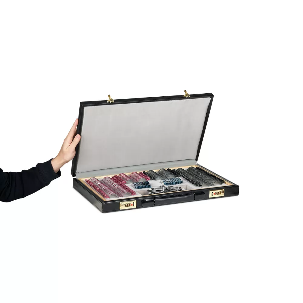 - В комплекте есть специальная универсальная пробная оправа со множеством различных регулировок. Это позволяет проводить обследование зрения пациентам с различной формой головы. Универсальная оправа позволяет установить до 4-х линз одновременно для более детального обследования зрения.