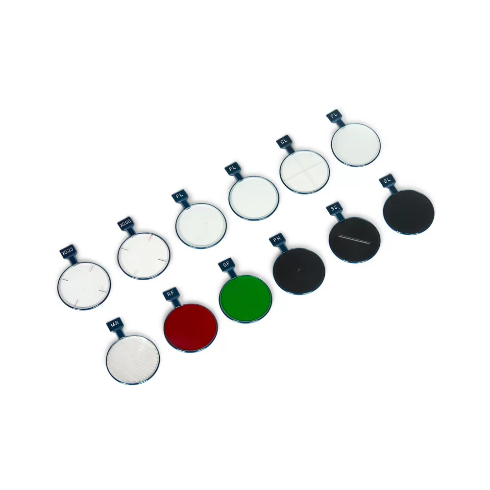 Матированная линза, Щелевая и Точечная диафрагмы, Окклюдер, Красный светофильтр, Зелёный светофильтр, цилиндр Мэддокса, Плоскопараллельная пластина, Линза с перекрестием, Скрещенные цилиндры |