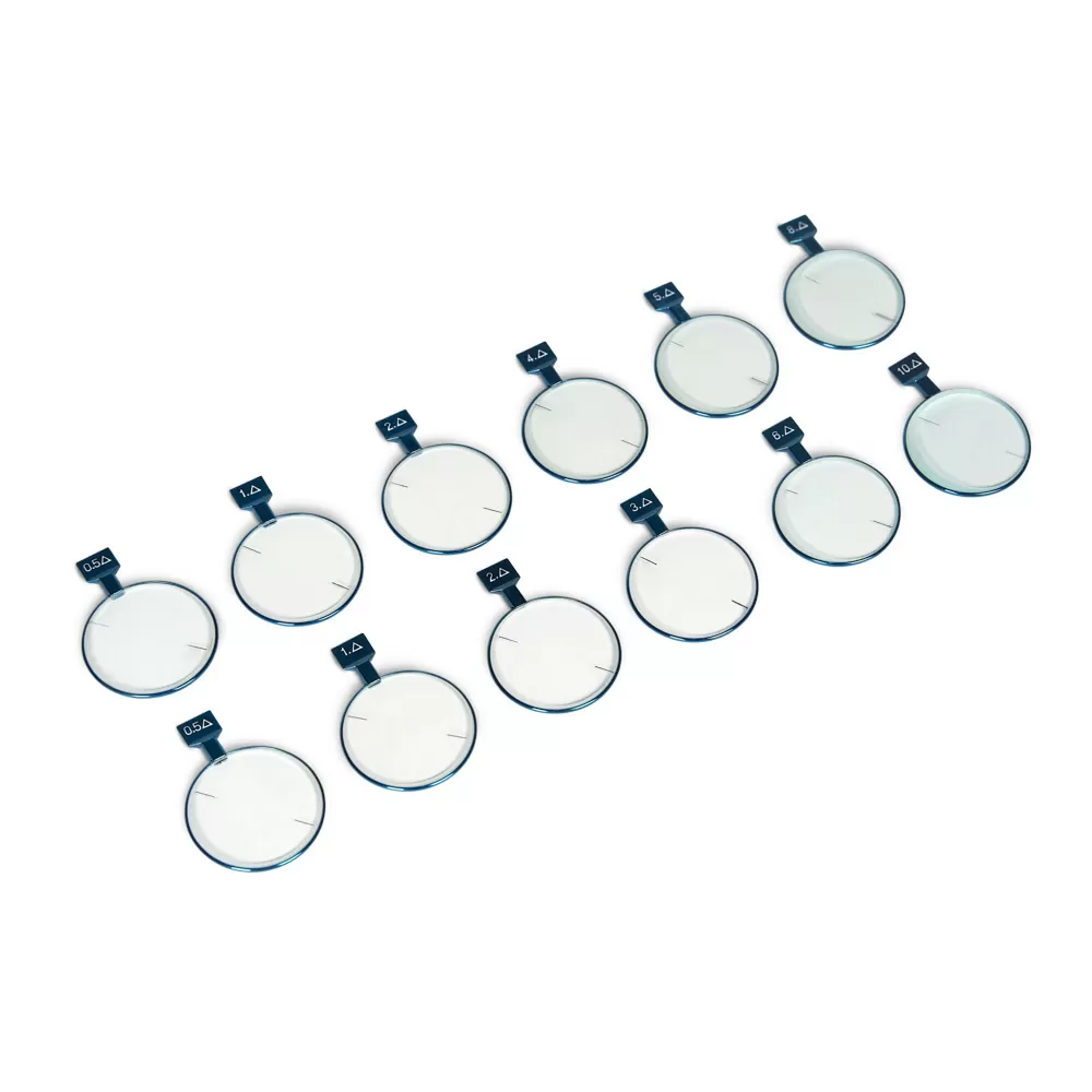 - Для проверки косоглазия и скрытого косоглазия, а также для тренировки структур глаз в наборе представлены призматические линзы. В набор входят очковые призмы от 0.50 пр дптр до 10.00 пр дптр