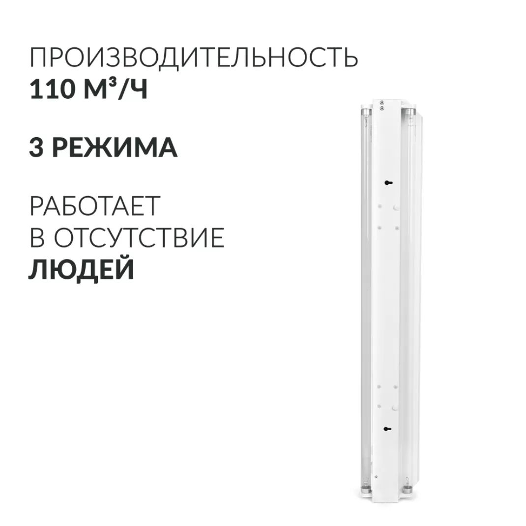 - Высокая эффективность. За счёт особенностей конструкции облучатель, работая всего от двух прямых ламп мощностью 30 Вт, за час очищает от вирусов и бактерий 110 м3 воздуха. Между непродолжительными сеансами очистки необходим перерыв в 2 часа. Во время работы прибора в помещении не должны находиться люди.