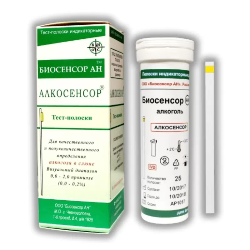- Полоски индикаторные предназначены для качественного или полуколичественного определения алкоголя в слюне человека. Несоблюдение процедур тестирования и интерпретации результатов может отрицательно сказаться на процессе тестирования и (или) привести к получению недействительных результатов. Поэтому результаты, полученные с помощью Полосок индикаторных АЛКОСЕНСОР, должны использоваться совместно с другими клиническими данными.