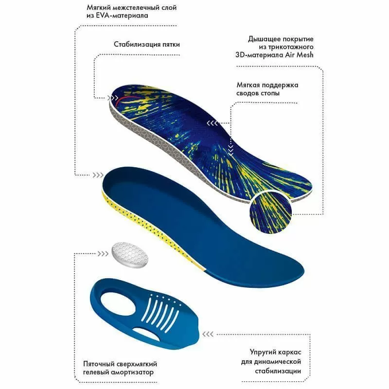 - Благодаря сложной многосоставной конструкции изделия стабилизируют стопы в правильном положении и придают амортизирующие свойства, что обеспечивает максимальный комфорт при повышенных физических нагрузках.