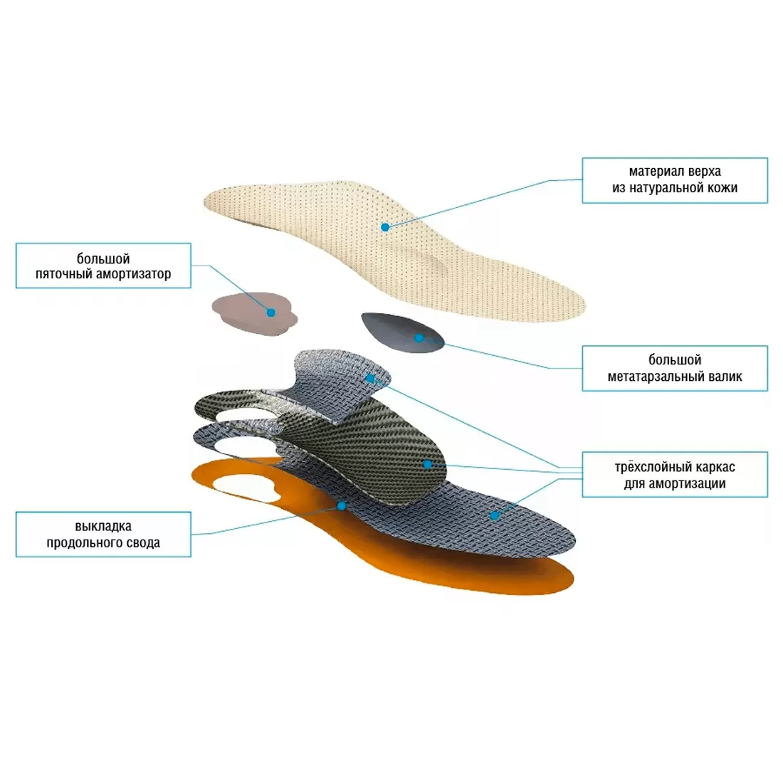 Верхний слой - натуральная кожа, Средний слой - ORTOREL, Материал валика - CARBOSANE, Пяточный амортизатор - CARBOSANE, Каркас – усиленный термопластик, Нижний слой – NO SLIP |