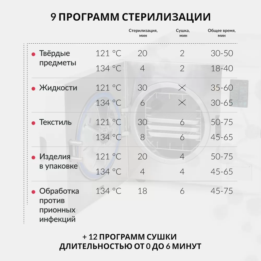 Паровой стерилизатор Армед DGT 18B оснащён камерой из нержавеющей стали объёмом 18 литров, водяным баком на 2,5 литра и баком для отработанной воды. Рабочие программы предусматривают обработку изделий при температуре 121 или 134 °C продолжительностью от 4 до 30 минут.