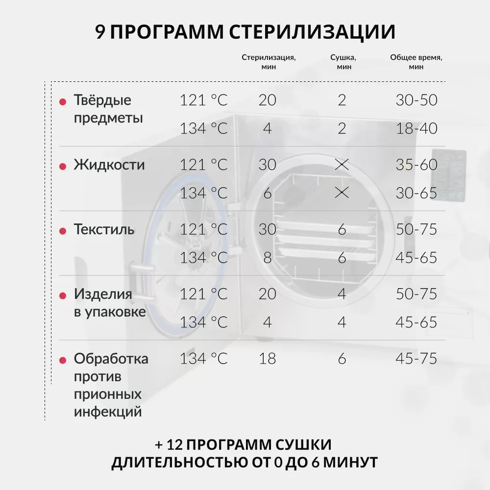 Паровой стерилизатор Армед DGT-23B оснащён вместительной камерой из нержавеющей стали объёмом 23 литра. Рабочие программы предусматривают обработку изделий при температуре 121 или 134 °C продолжительностью от 4 до 30 минут.