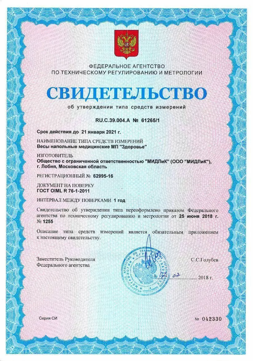 Весы включены в реестр медицинской техники Российской Федерации, имеют Свидетельство на тип средства измерения, соответствуют требованиям ГОСТ OIML R 76-1—2011 и ТУ 9441-032-56692889-2012.