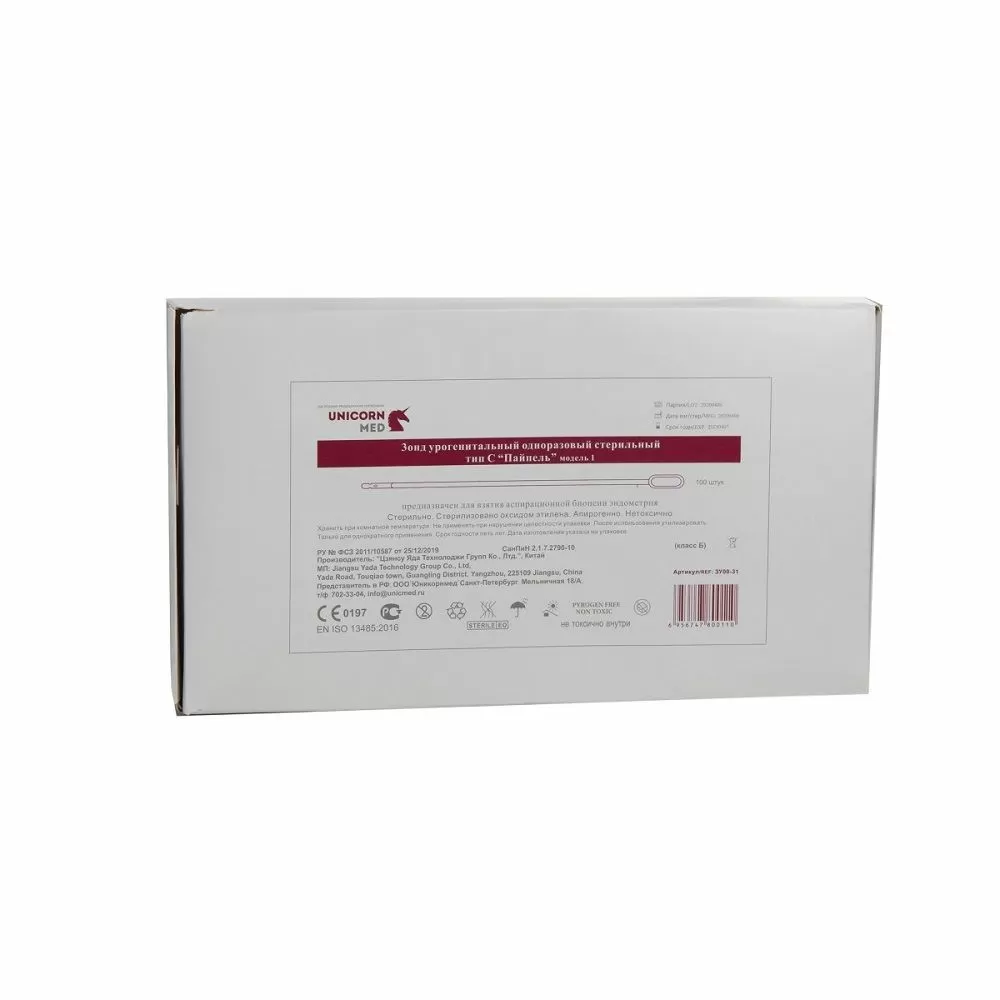 Внутриматочная кюретка из высококачественного полимерного материала с пластиковым поршнем. Зонд имеет закрытый конец с 4 боковыми отверстиями, состоит из двух частей: поршня с ограничителем и зонда. На зонд нанесена маркировка глубины введения, поршень цилиндрической формы с ручкой для удержания и ограничителем глубины введения в зонд.